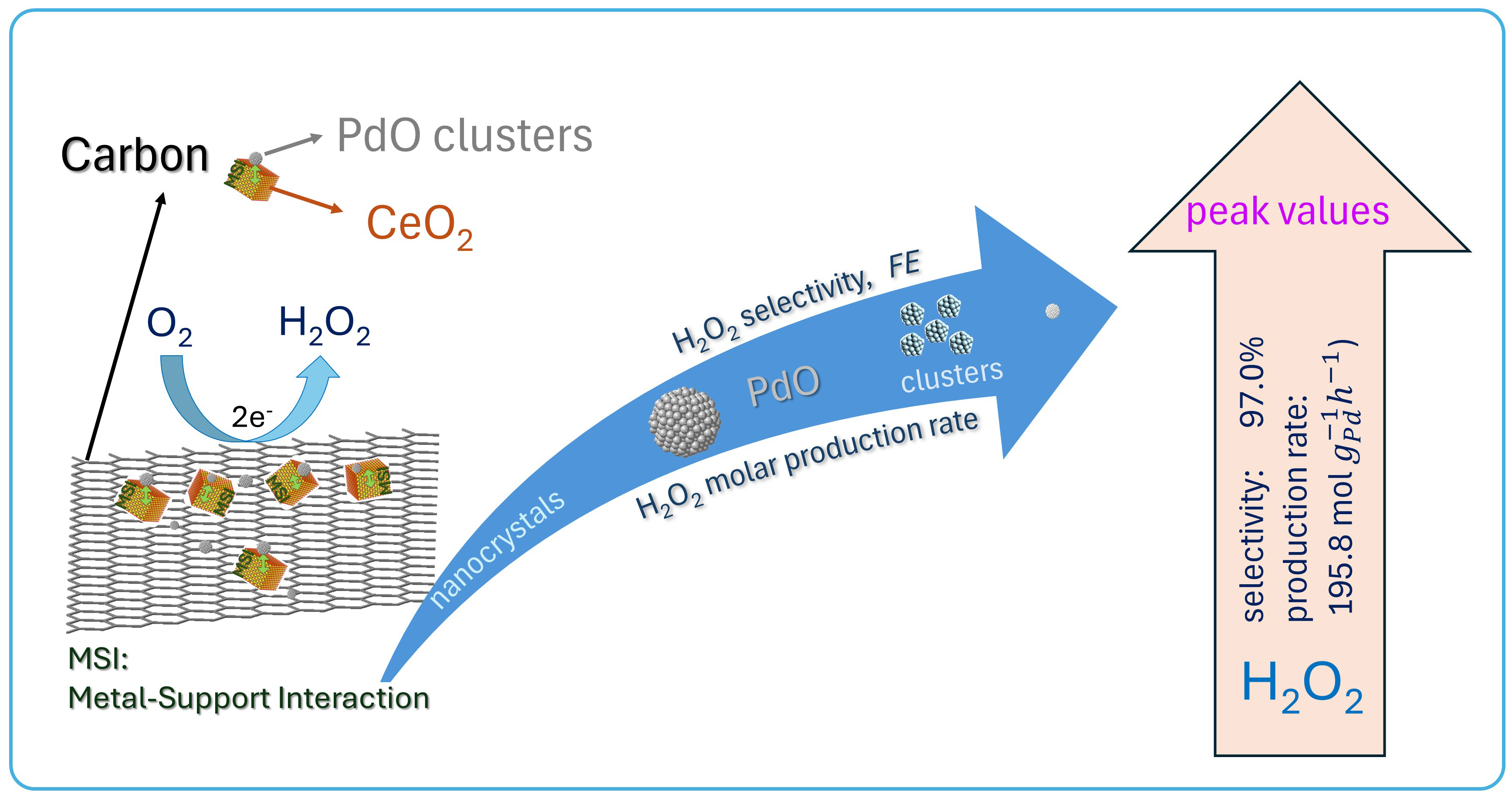Our recent work focuses on palladium (Pd)-based single-atom catalysts and clusters for hydrogen peroxide (H2O2) electrosynthesis. This research is supported by the New York State Energy Research and Development Authority (NYSERDA). In this project, isolated reactive metal adatoms are deposited into host metal surfaces composed of relatively inert metals, enabling precise control over catalytically active sites. The catalytic performance of these materials strongly depends on the composition, structure, and metal–support interactions within the catalyst system. In particular, we are exploring PdO–CeO2–carbon catalyst systems, where strong metal–support interactions can promote efficient and scalable electrochemical H2O2 production. While these catalysts demonstrate promising activity and selectivity, improving their long-term stability remains a key challenge. This study aims to understand these structure–activity relationships and develop more robust catalyst designs for practical and scalable applications.